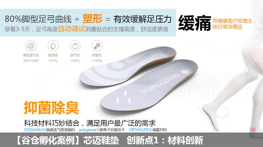 创新点一:材料创新。把红酒软木塞这个材料移植到鞋垫中,具体功能上可以除臭、抑菌,还有很强的透气性。目前芯迈科技就靠着卖鞋垫,去年销售额已经突破了1000万元。