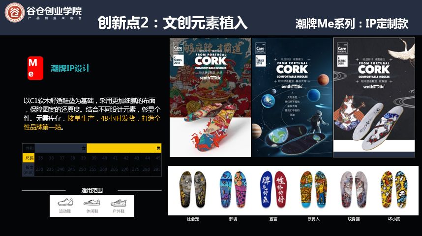 创新点二:在鞋垫上加上创意图形,用户可以定制选择。比如很多年轻人恶作剧,就会把老板的头像印上去,再比如过年时,他们会印“踩小人”的鞋垫等等。一双鞋垫就可以把文创元素融合进来,进而提升销量。
