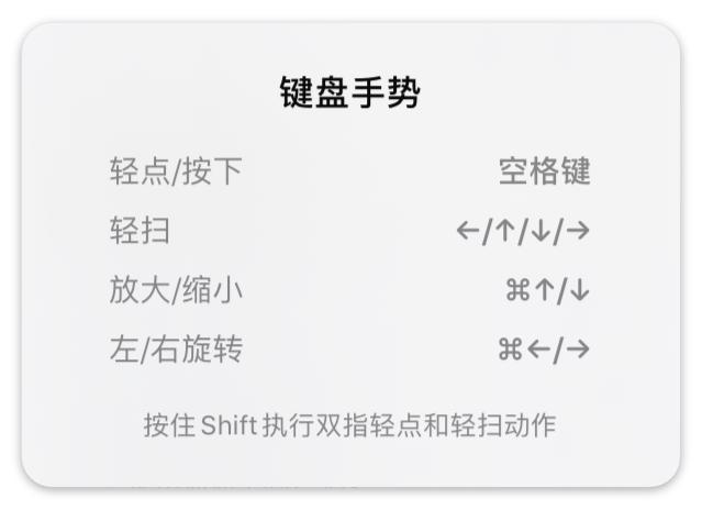 在「键盘手势」模式里,你的方向键也变成了朝四个方向滑动屏幕的手势。而 Command + 方向键则对应着放大缩小以及旋转的操作。如果你想要用双指点按或滑动屏幕,只需要按住 Shift 键,再点击空格或方向键即可。