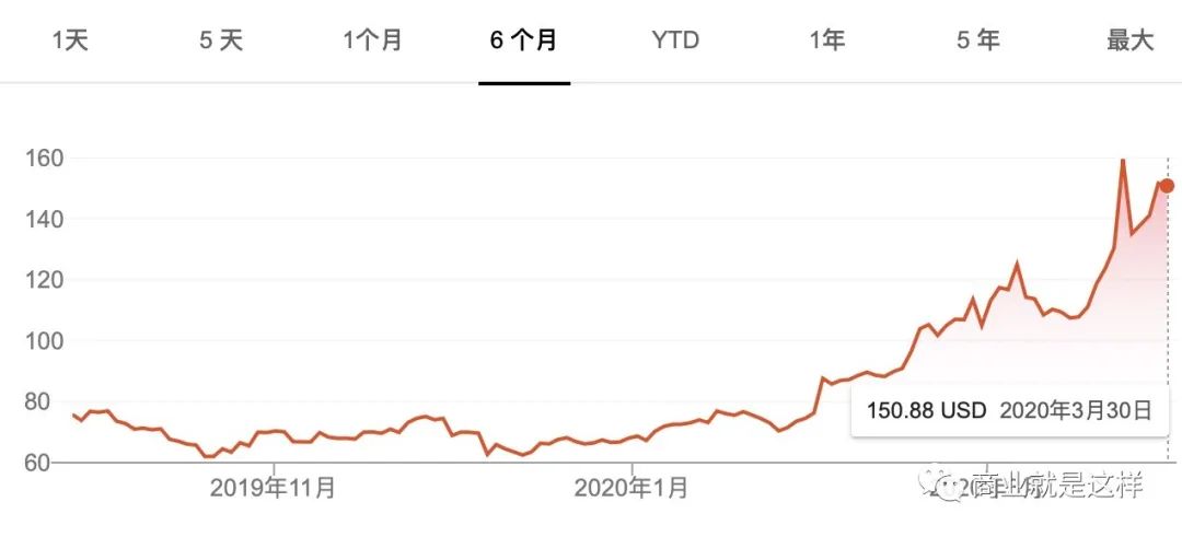 Zoom的股价也是扶摇而上,从1月底的76美元左右,到3月30日美国周一时间收盘的151美元。即便中间经历了3次美股熔断,特斯拉这位美股市场1月份的明星经历了从917美金到最低316美金的洗盘,Zoom股价只是轻微下探10%左右,然后继续转头向上。两个月时间里,市值翻了一倍,到达420亿美元,市盈率1764倍。