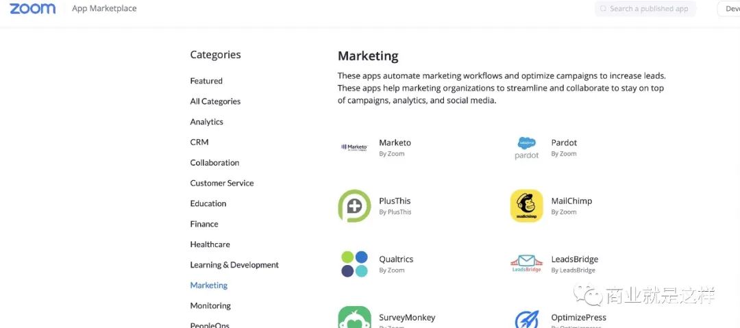 Zoom并不是看清楚开放的策略,Zoom试图打造一个应用市场(Marketplace),为用户提供“Zoom版本”的各种办公工具。