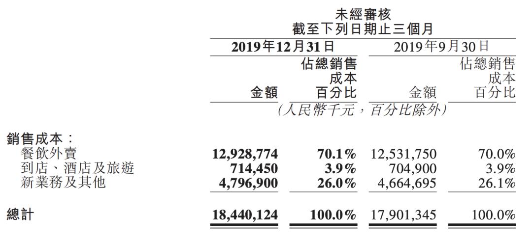 财报数据显示,餐饮外卖业务的销售成本由 2018 年的人民币 329 亿元增加 35.7% 至 2019 年的人民币 446 亿元,主要由于外卖骑手成本增加。