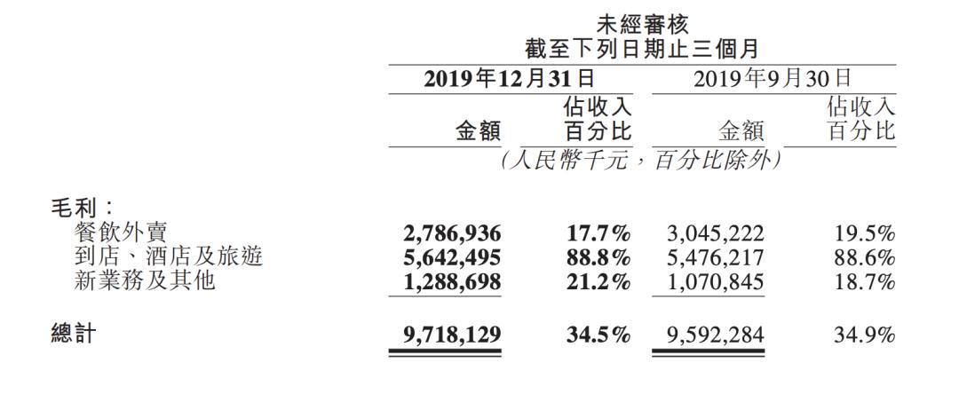 2019 年,餐饮外卖收入同比增长 43.8% 至人民币 548 亿元。2019 年,餐饮外卖业务毛利增长 94.2% 至人民币 102 亿元,毛利率由 13.8% 同比上升至 18.7%。
