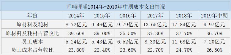 扩张过程中,呷哺呷哺一直强调的成本控制做的如何?以其中占比最大的原材料及耗材和员工成本为例: