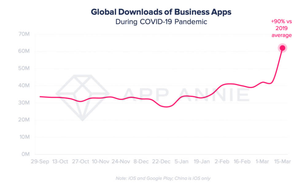 3月31日消息,据外媒报道,在家办公的政策、保持安全社交距离和政府“封城”增加了企业和个人对视频会议应用的需求。权威移动应用和数据分析平台App Annie发布最新报告显示,商务视频会议应用程序一直在经历爆炸式增长,刚刚在3月份创下了有史以来下载量最高的新纪录。
