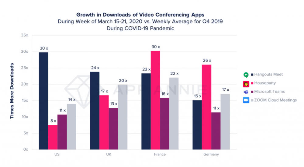 在3月14日至21日之间的7天内,视频会议应用的下载量超过了6200万次,比前一周增长了45%。与此同时,社交网络视频应用Houseparty在欧洲“封城”和家庭隔离期间也出现了惊人的增长。虽然这样的增长是意料之中的,但App Annie的报告提供了关于这些应用程序在此期间获得了多少新客户的真实数据。