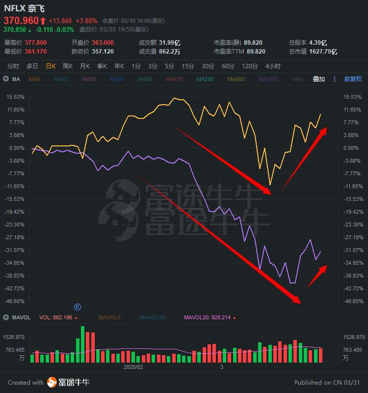 发债的方式确实缓解了迪士尼的燃眉之急,不过迪士尼的业务线中,除了受影响的乐园、酒店、邮轮、影院等收入外,其实流媒体业务是受益的,虽然ESPN+体育直播业务受影响较大。专做流媒体业务的奈飞就几乎不受大盘影响,股价跌落后回升,但是迪士尼依旧处在低位。
