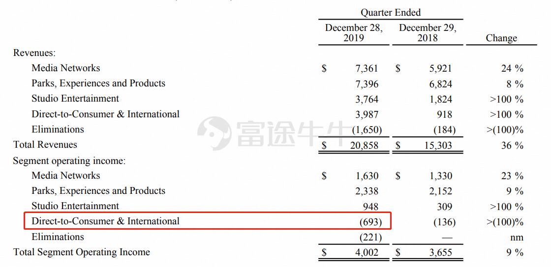 2020财年第一季度财报显示,Disney+是此次财报的最大亮点,截止2019年底,Disney+流媒体服务订阅用户为2650万,大大超出此前市场预期的2000万。Disney+一直以来就备受欢迎,自从去年推出以来就为迪士尼赚足了眼球,上线第一天注册用户就超过了1000万,也成为了2019年迪士尼股价上涨的催化剂。