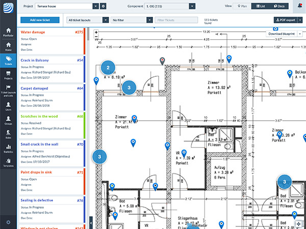 其数字化工具以App的形式在苹果ios、安卓以及Windows操作系统中开放下载。使用中,用户需将建筑施工图上传到「PlanRadar」平台上,平台提供功能包括,