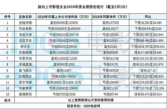 国内上市影视企业2019年度业绩预告统计 图源网络