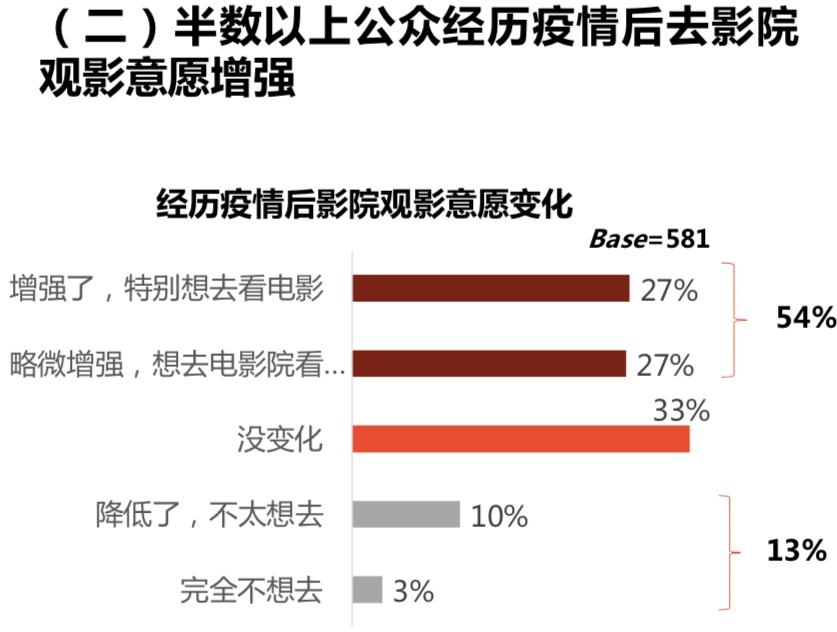 猫眼研究院调研结果显示,观众对疫情过后观影的意愿增强。近七成观众选择在疫情结束之后“聚餐吃饭”和“去电影院看电影”;并且半数以上观众在经历疫情后影院观影的意愿增强,27%的观众表示“特别想去看电影”。