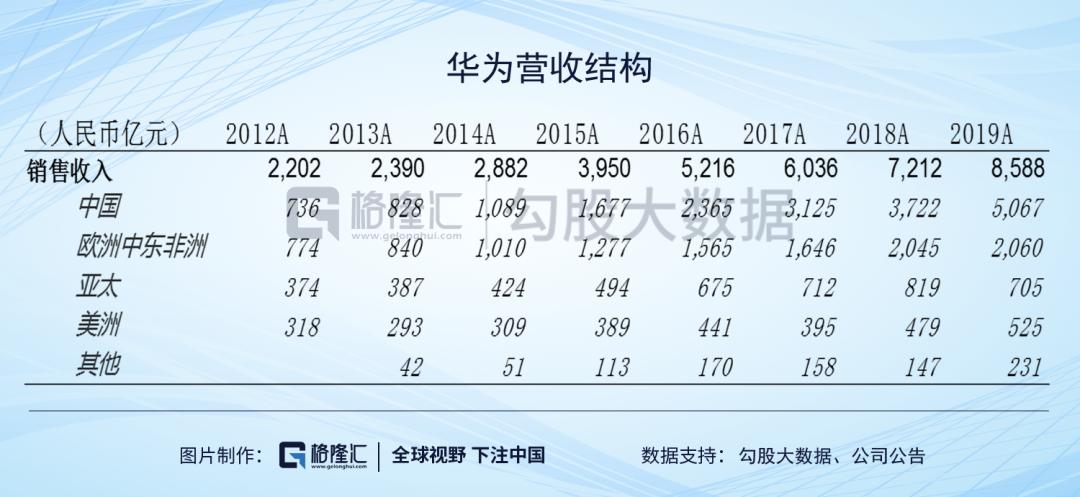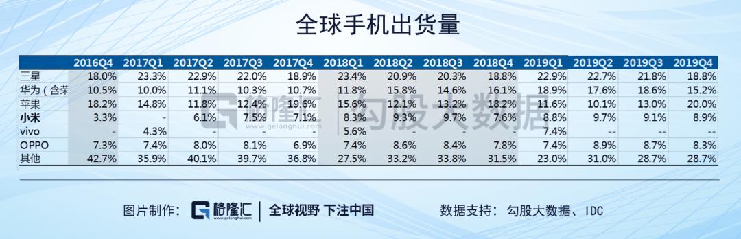 另外一个是华为产品结构方面的问题,从IDC全球出货量来看,华为Q4出货量5620万台,同比去年已经有所下滑,而且我们也分析过华为2019年营收增量主要来自国内市场,两者叠加考虑,就可以看到华为海外市场萎缩的相当厉害。