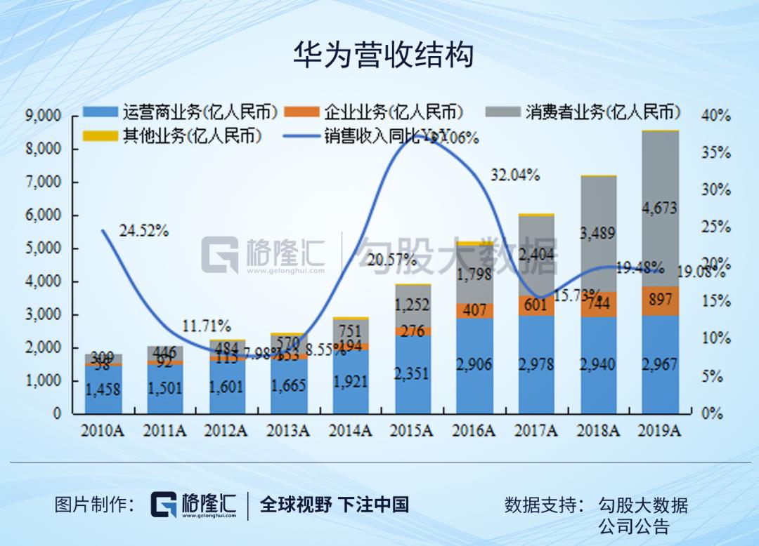 华为两块主要业务是运营商和消费者服务业。2019年属于运营商业务承前启后的一年,因为全球的4G建设基本接近尾声,而国5G基站刚开始开始量产,整体能提供的业绩增量很少。2020年5G开始批量建设之后,三大运营商给的CAPEX指引都比2018年要高,预计2020年华为国内运营商业务会有所好转,而海外因为疫情的原因,即使有订单也会延迟交付,压力会很大。