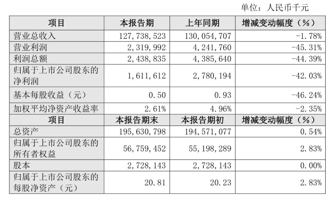 净利润大幅下降42.03%,营业总收入、营业利润、利润总额、归属于上市公司股东的净利润、基本每股收益、加权平均净资产收益率等主要财务指标也都是同比下滑。