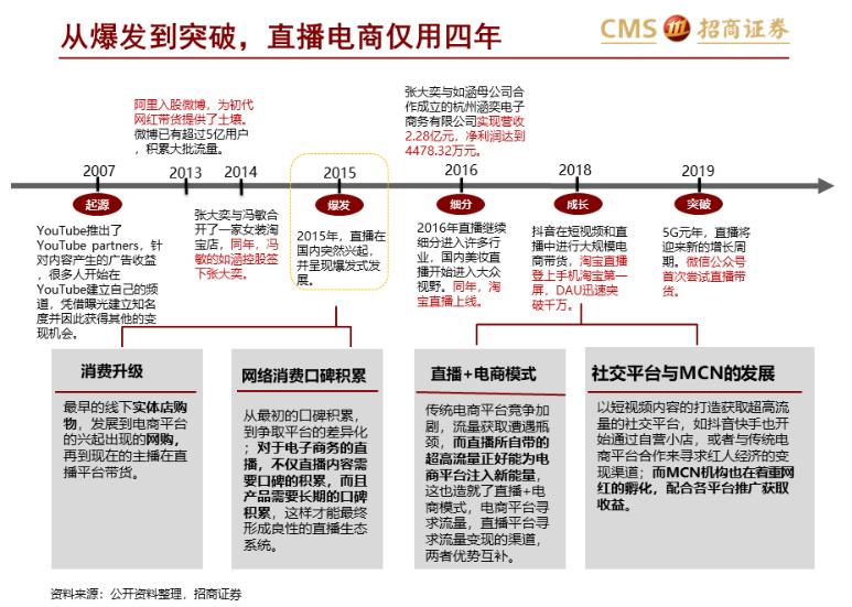 另一边,如今直播带货的巨大流量和变现能力确实足够诱人。根据招商证券在1月5日发表的《新零售研究之直播电商系列》显示,直播电商从“爆发”到“突破”仅仅用了四年的时间,2019年直播电商总成交额约超过3000亿元,未来也有望冲击万亿体量。
