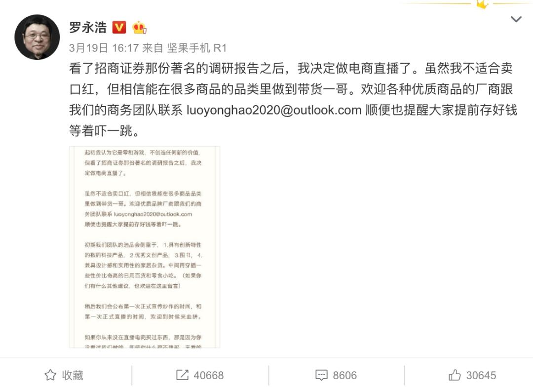 数据增长之间,不仅是数字叠加那么简单,而是不断向外界传递出一个行业积极的信号——巨大的流量正在涌向直播电商。老罗也正是被吸引者之一,“看了招商证券那份著名的调研报告之后,我决定做电商直播了。”按照罗永浩的陈述,他之所以做出了进军直播的决定,是看到了直播带货背后的超强变现能力。