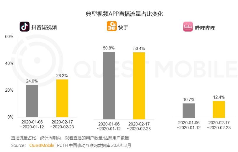 一方面,抖音最新公布的数据称,在今年1月日活跃用户已经超过了4亿。而第三方数据机构QuestMobile发布的《中国移动直播行业”战疫”专题报告》也显示,疫情期间看直播成为休闲娱乐、获取资讯的方式,抖音的直播业务虽然不及快手的50.4%的流量占比,但增长速度高于快手,未来在消费能力上也有着可挖掘的潜力。