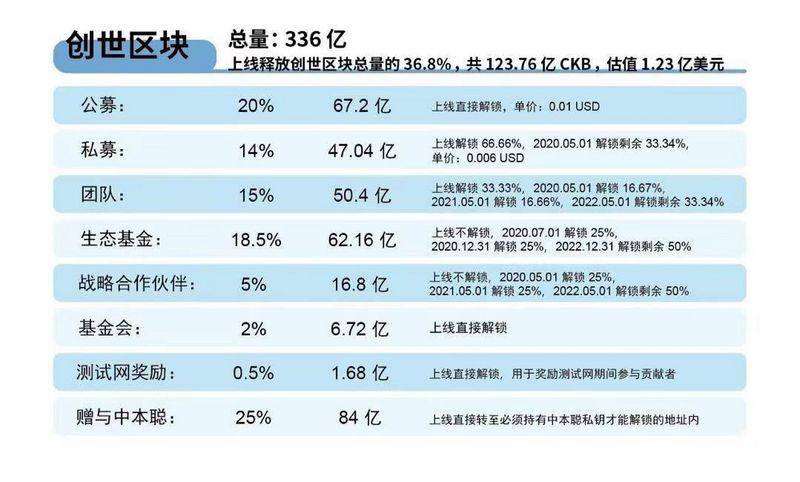 根据 Nervos 的设计,CKB 没有总量上限。创世区块会产生 336 亿的 CKB,其中 84 亿将被立即销毁,剩余分给相关参与方,解锁方式也略有区别(见下图)。其中,私募、团队和战略合作伙伴的部分代币(合计 28 亿枚)将在今年“五一”被解锁,届时会引发又一轮下跌吗?