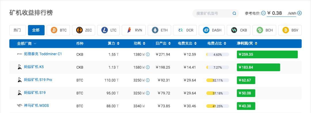 翻看各大矿池的矿机收益排行,两款 CKB 矿机——Toddminer C1 和蚂蚁K5 的挖矿净利一马当先。