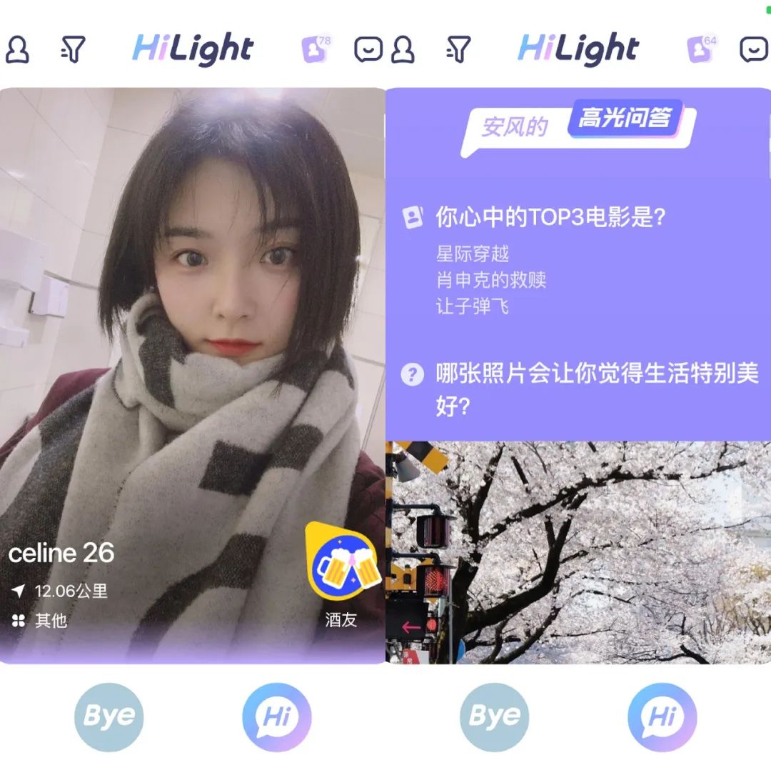 从产品设计上看,HiLight的另一个微创新是留给用户展示形象的空间更丰富了。它能承载的不止一张照片,在“高光问答”环节,用户可以综合图片文字,向其他人展示更为丰富的兴趣爱好等话题性细节。
