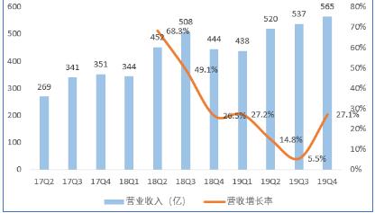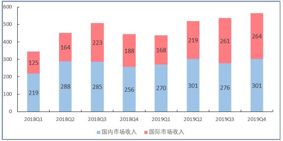 2019Q4收入565亿元,同比增长27.1%,创小米季度收入新高,经调整后第四季度净利润为23亿元,同比增长26.5%,境外收入264亿元,占总收入的46.8%,境内收入301亿元,占总收入53.2%。