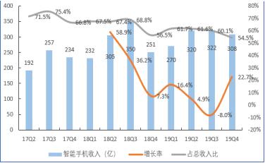 2019年,智能手机部分的收入达1221亿元,同比增长7.3%,2019Q4,智能手机部分的收入308亿元,同比增长22.8%。销量方面,2019全年,智能手机销量达到124.6百万部,2019Q4,智能手机销量达到32.6百万部,同比增长30.5%。