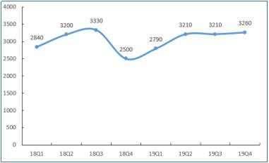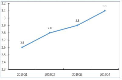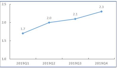 2019年第四季度,得益于公司持续优化移动互联网产品,增强用户黏性,广告收入达到30亿元,同比增长17.8%;游戏收入达到人民币8.7亿元,同比增长44.4%;中国大陆智能手机广告及游戏以外的互联网服务收入(包括电商平台、金融科技、电视互联网及海外互联网服务)同比增长112.6%,占2019Q4互联网服务总收入的43.0%,推动了互联网业务的整体增长。截至2019年12月,MIUI月活跃用户数达到309.6百万,同比增长27.9%,其中中国大陆地区的MIUI月活跃用户数为109.0百万。