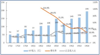 2019年,IoT与生活消费产品部分收入621亿元,同比增加41.7%。2019Q4,IoT与生活消费产品部分收入195亿元,同比增加30.5%。