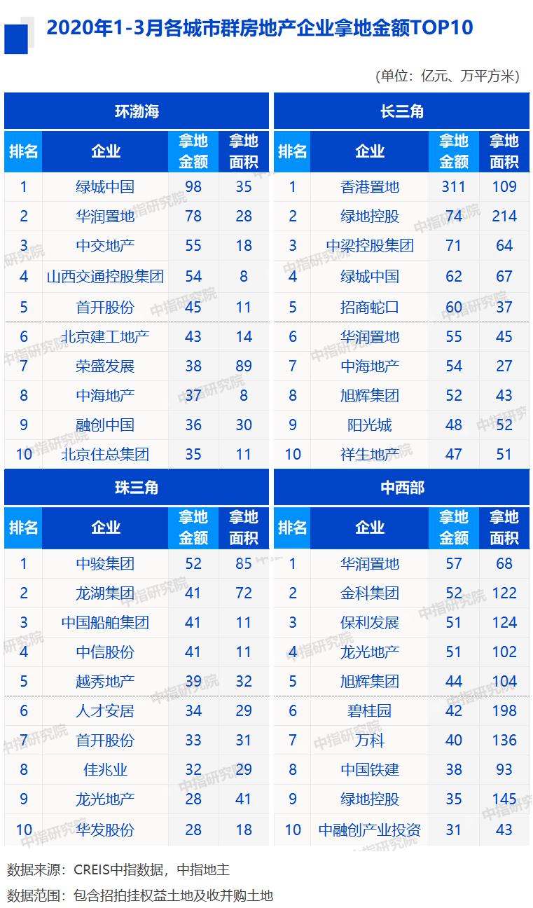 中指研究院今日(4月1日)发布的《2020年1~3月全国房地产企业拿地排行榜》显示,今年一季度,头部房企获取土地资源优势有所减弱,香港置地、华润置地和绿城中国占据拿地榜前三位,拿地金额合计达696亿元;而TOP10房企拿地总额为1501亿元,比2019年的1904亿元下降了21.2%。