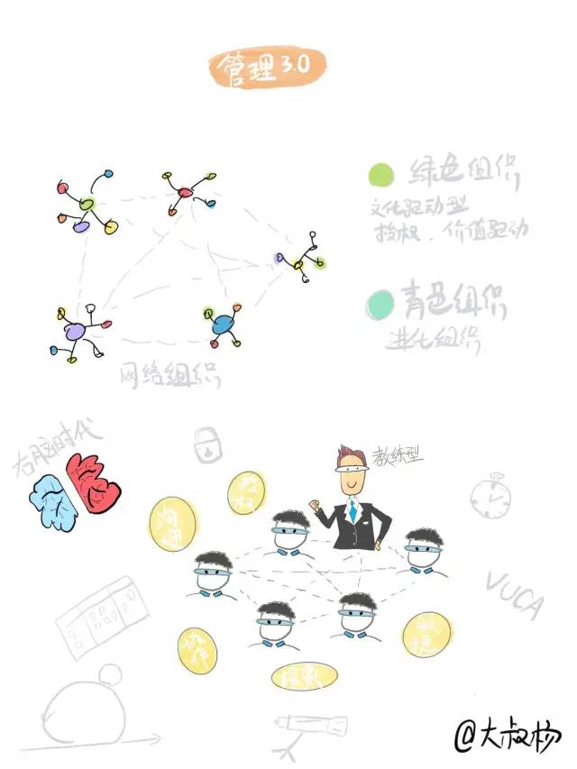 从根本上讲,进入到管理3.0时代,传统的左脑驱动的固化逻辑思维,会逐步被右脑驱动的创新成长型思维替代。绿色组织是这个时代的代表,以各种社区、非营利性组织为代表,这种组织更讲究文化和价值驱动,更追求共识和共创,在组织内存在大规模的“赋能”活动。青色组织是这个时代的另一个代表,属于更高层级的进化组织,依靠使命和愿景驱动,员工自我管理。
