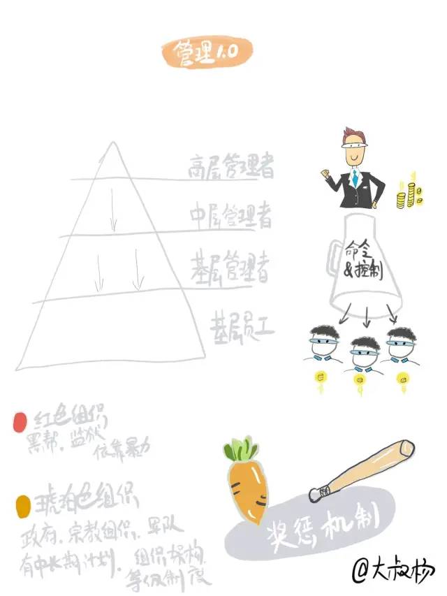 进入到工业时代后,很多工作产业化,工作不再是简单的重复了,也存在大量繁杂的工作,大量需要协作的工作,所以泰勒的“科学管理”出现了,管理进入了“1.0”阶段,这个时候出现了“金字塔型”的组织架构,管理出现了层级,工作基本以上级命令,下级执行为主,劳动分工也是这个时期出现的,人是典型的“机器”和“资源”,以“大棒”为典型代表的惩罚制度比较流行。