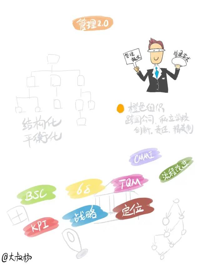 近几十年,随着计算机和智能手机的发展,信息的流动加速,世界的不确定性、复杂性急剧增加,越来越多的“混沌”情况出现,管理进入了“3.0”阶段,敏捷管理随之出现,敏捷最早以“敏捷开发”出现在软件行业,现在已经从开发扩展到整个组织,从IT行业扩展到了很多不同的行业。管理3.0阶段的组织,组织架构出现了网络化的趋势,传统的管理层级和命令型方式开始瓦解,更追求员工工作的幸福感和归属感。