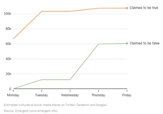 同时,辟谣内容的传播力弱于谣言。相比一条阴谋论刷爆社交媒体,我们很难看到一条辟谣文章变成10万加的爆款。哥伦比亚大学数字新闻学塔尔中心的记者Craig Silverman开发了一款名为Emergent的谣言传播跟踪工具,可以记录Twitter和Facebook上每一条谣言及辟谣的分享次数,发现大部分的谣言获得的分享次数都要比辟谣的高得多。