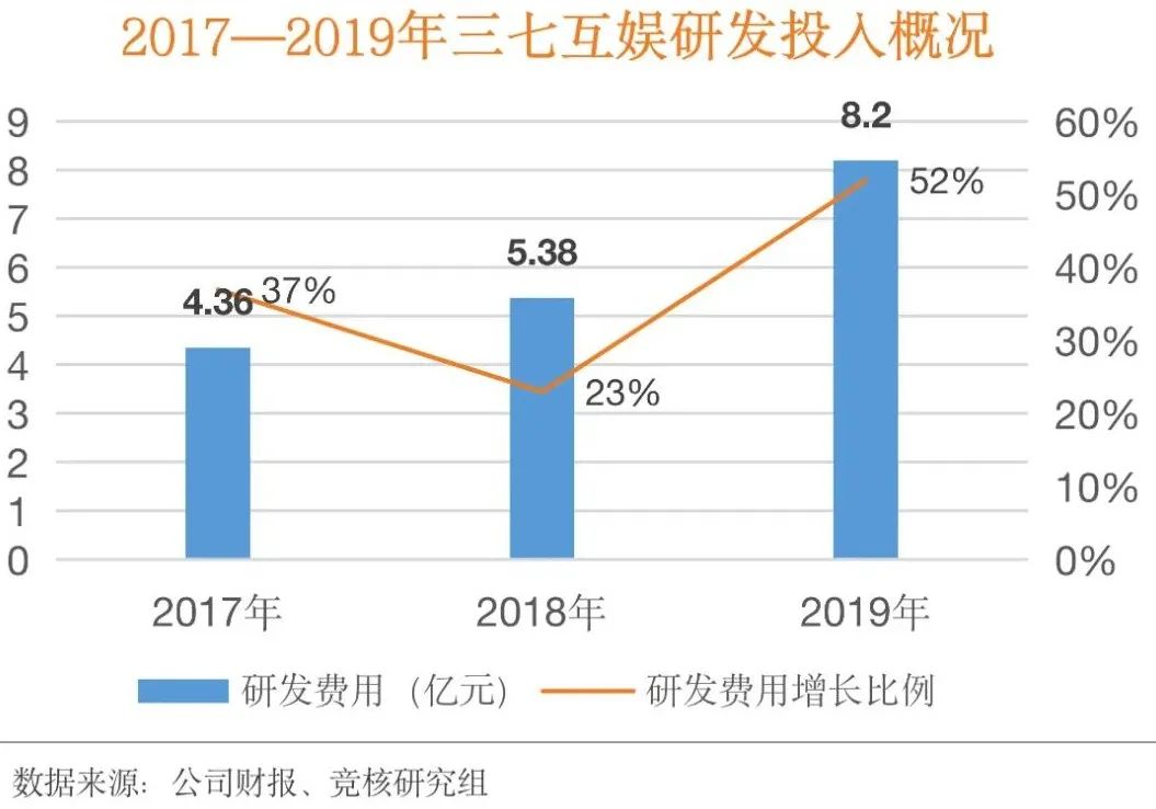 具体到研发层面,三七互娱在2019年的研发费用高达8.20亿元,较上年增长52.57%。