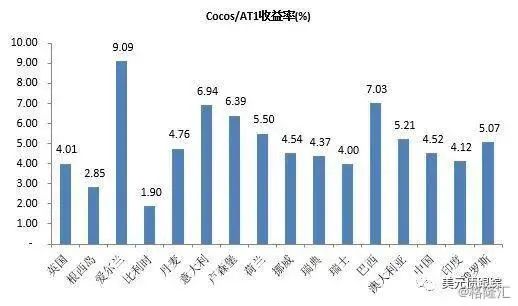 全球银行为满足巴塞尔协议要求而大量发行附属一级资本工具,但不同的国家/区域银行发行的附属一级资本的收益风险价值比并不相同。从国家来看,欧洲以意大利、希腊等国家风险相对较高、收益也高。亚太地区以俄罗斯风险较高。拉丁美洲以巴西为主的收益高达7%以上。欧洲附属一级资本工具收益率大部分普遍高于6%,而中国等收益率则集中在4%-6%附近(收益均采用该地区或者国家发行的美元CoCos债/AT1为统计对象)。