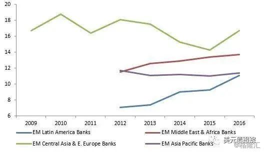 不同区域具有不同的收益风险比,横向比较来看,欧洲和拉丁美洲收益率相对较高,同时也面临较大风险。从统计数据来看,当前全球银行的资本充足率还需要进一步提高,其供给也将进一步加大。