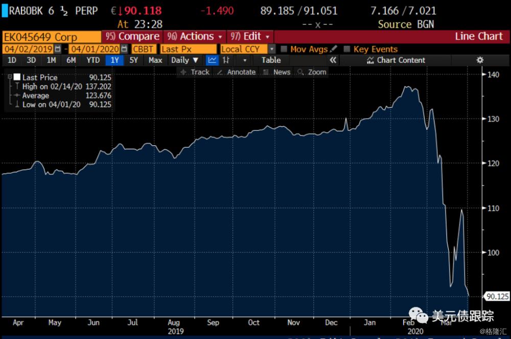 那汇丰的Coco算惨吗?我们再看看刚刚宣布停止支付票息(注意不是股息)的荷兰合作银行(简称Rabo)的Coco表现:从110直接暴跌25块至90块,过去1个月,Babo差不多跌了50块。价格从接近140直接跌倒90附近handle,Rabo:汇丰,比惨吗?