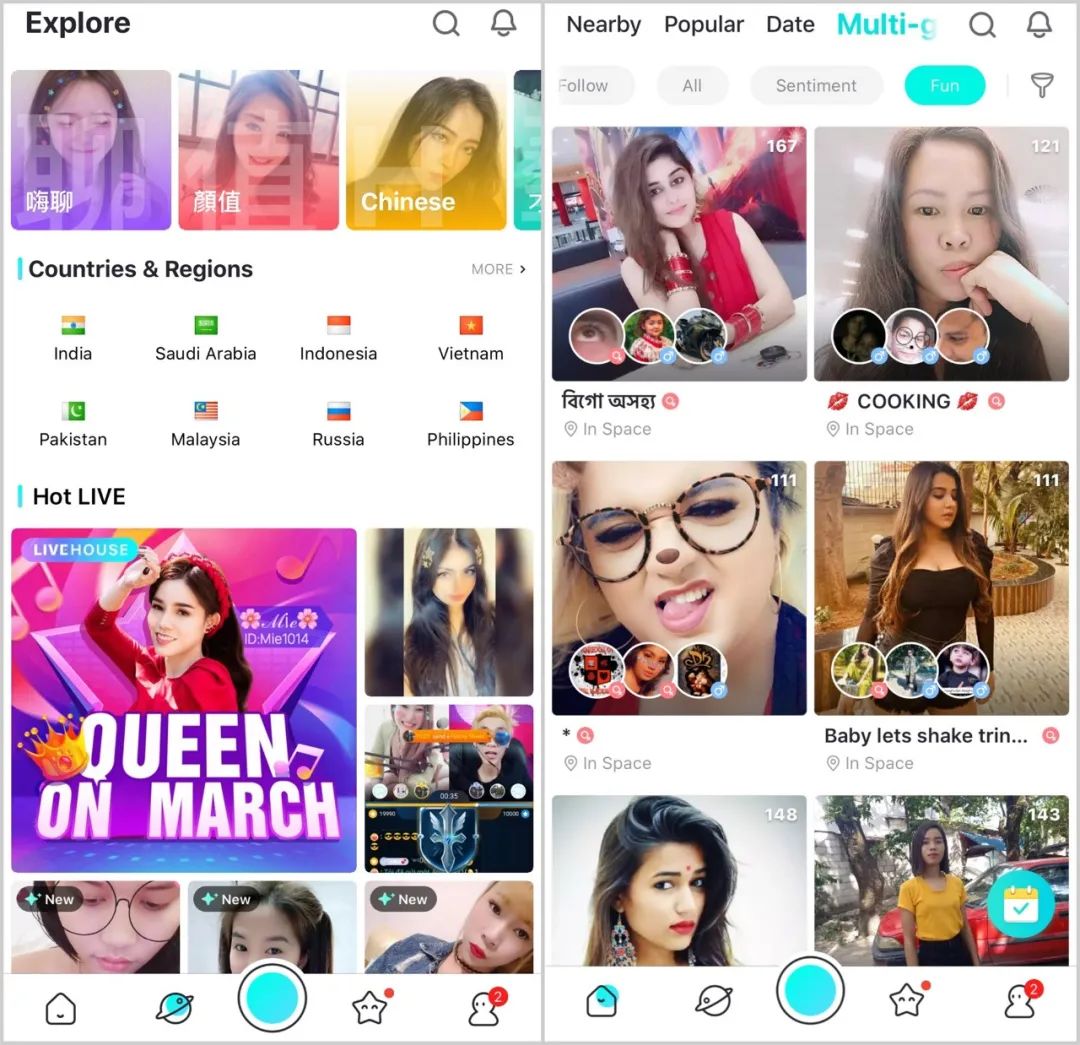 Bigo Live表面是直播产品,本质是社交产品。印尼、印度的用户喜欢在多人房聊天,然后组团打游戏、交友。九人房可以插科打诨,百人房可以念经文,而最受欢迎的是六人房,每个人听和说的时间可以平衡得最好。