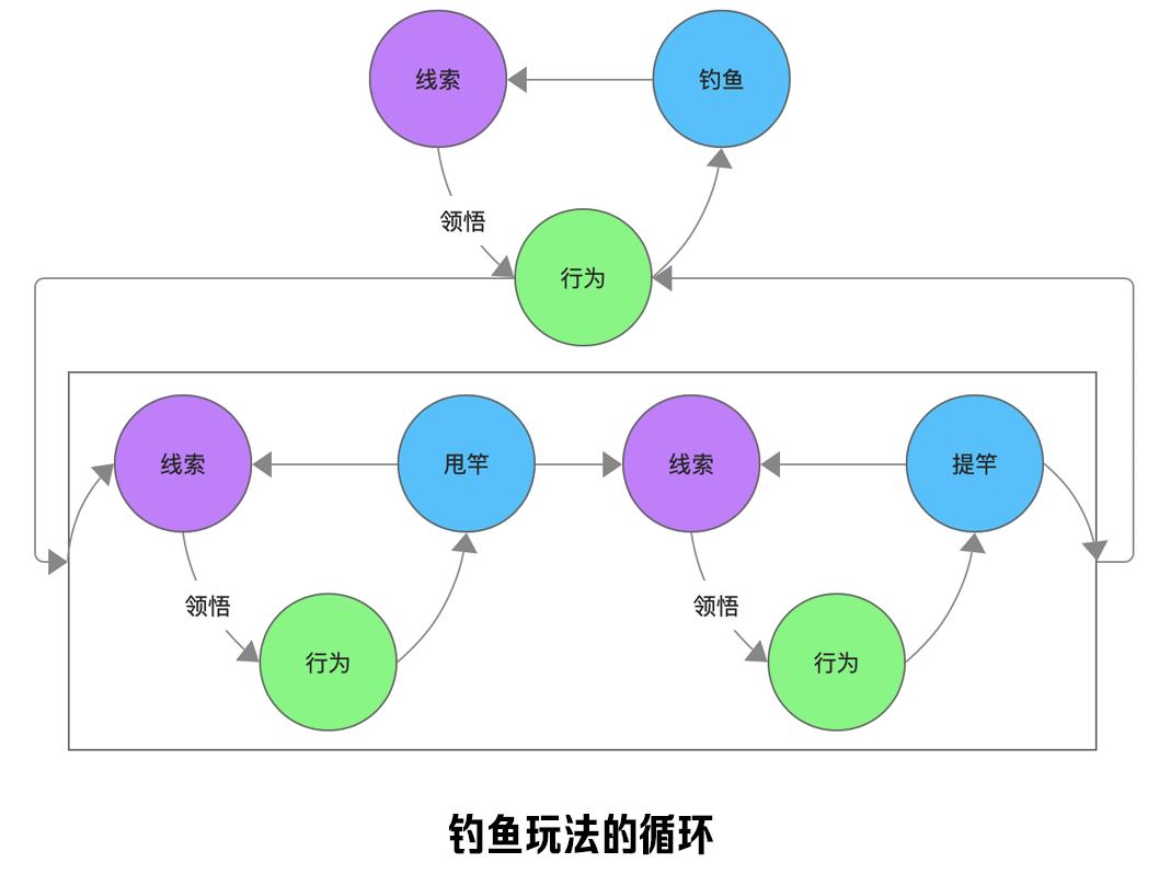 如果说定位决定了游戏是否有吸引力,那么策划水平就是游戏是否能玩下去的核心。而这个策划核心我有个自己的模型,称为「反馈循环链」。篇幅有限,就不多展开讲了,我们只来聊聊钓鱼这个例子好了。