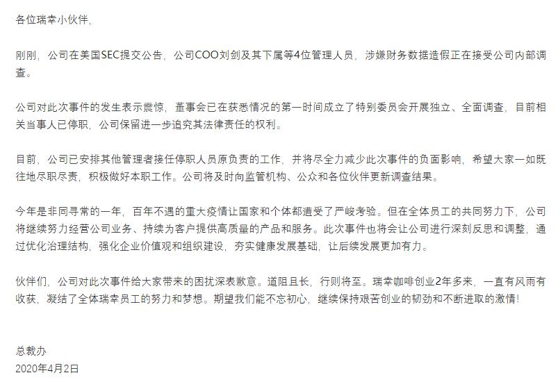 根据一封内部信显示,瑞幸称对此次事件发生表示震惊,目前相关当事人已停职且其负责工作已安排其他管理者接任,并将尽力减少此次事件的负面影响。公司呼吁员工不忘初心,继续做好本职工作,称“道阻且长,行则降至”。