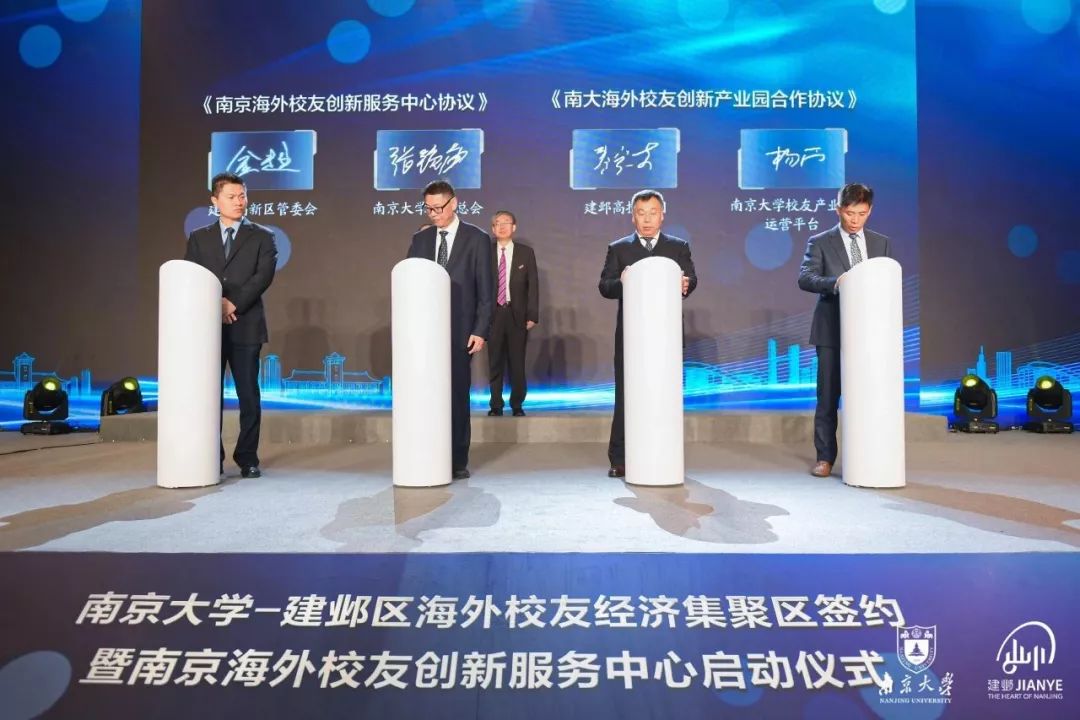 12月7日,南京大学-建邺区海外校友经济集聚区签约暨南京海外校友创新服务中心启动仪式在河西金陵江滨酒店举行。签约仪式上,南京大学与建邺区人民政府签署了《加强校地合推动“校友经济”集聚发展合作协议》,南京大学校友总会与建邺高新区管委会签订了《南京海外校友创新服务中心协议》, 南京大学校友产业园运营平台与建邺高投集团签订了《南大海外校友创新产业园合作协议》。南京大学海内外84个校友组织、226名校友代表一同在现场见证了此次签约和南京海外校友创新服务中心的正式启动。