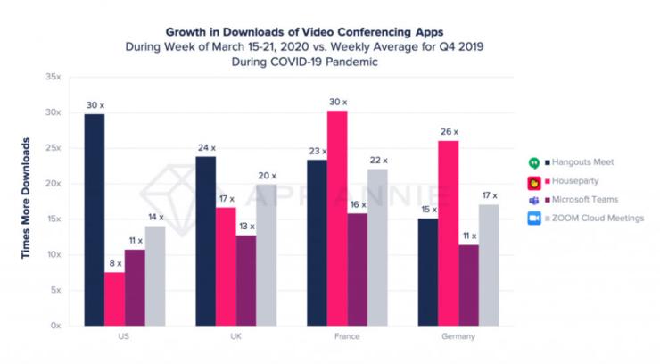 App Annie显示,Zoom下载量激增,从周平均下载量来看,美国增加了14倍;英国20倍;法国22倍;德国17倍。