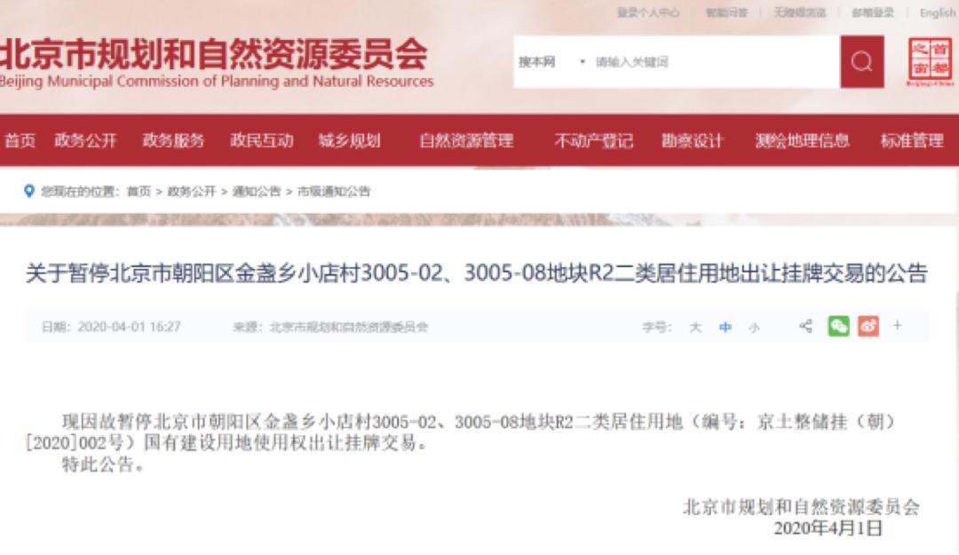 4月1日,北京市规划和自然资源委员会发布公告称,因故暂停朝阳区金盏乡小店村3005-02、3005-08地块的挂牌出让。原计划4月2日公开出让的北京朝阳金盏3005-02、3005-08地块由于无企业报价,暂停出让,已从国土局网站撤下,成为2020年以来首宗“暂停”的纯商品房地块。