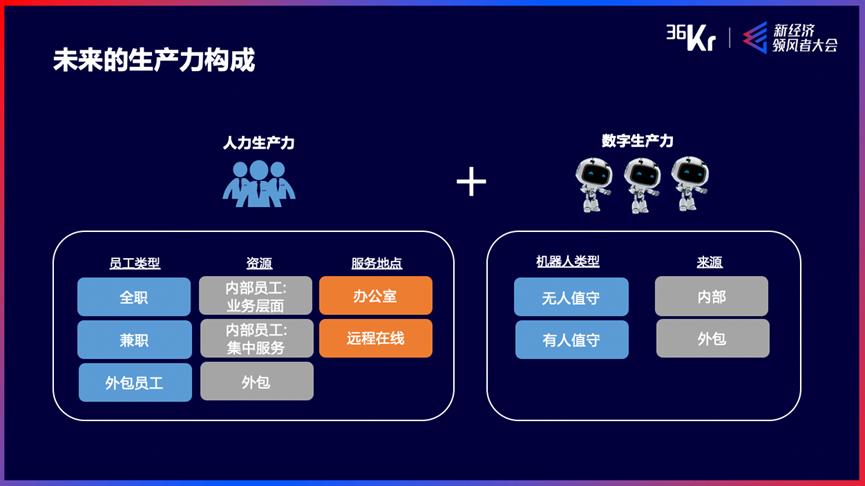 所以我们认为,未来无论是政府部门还是企业,不仅仅需要有人工生产力,也会需要有数字化生产力。前面几位嘉宾分享过,今天有很多企业通过灵活用工、共享员工的方式去提高人力生产力效率,我最后补充的是,除了人力生产力之外,企业要降本增效,要提高员工的幸福感,还需要引入数字化劳动力。