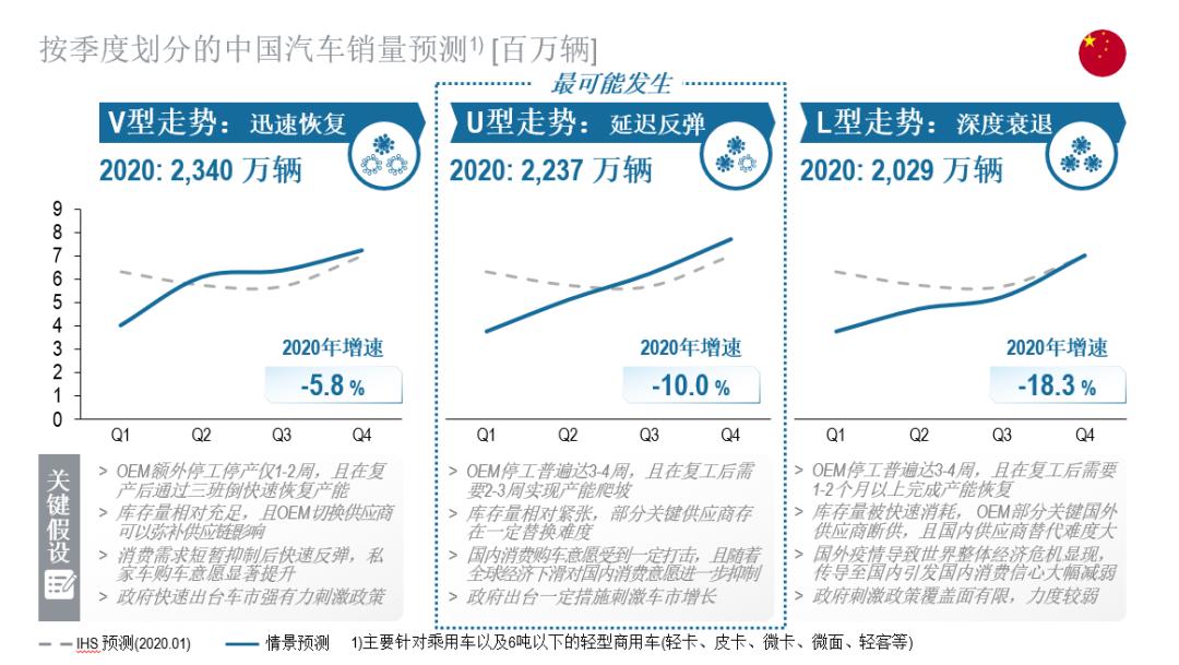 中国车市销量影响:基于不同情景下中国汽车产业供给端、需求端与政策端情况的综合研判,"U型延迟反弹"情景最可能发生,导致2020年国内汽车销量下降约10%,而2021年则有望迎来10%-12%的销量反弹。