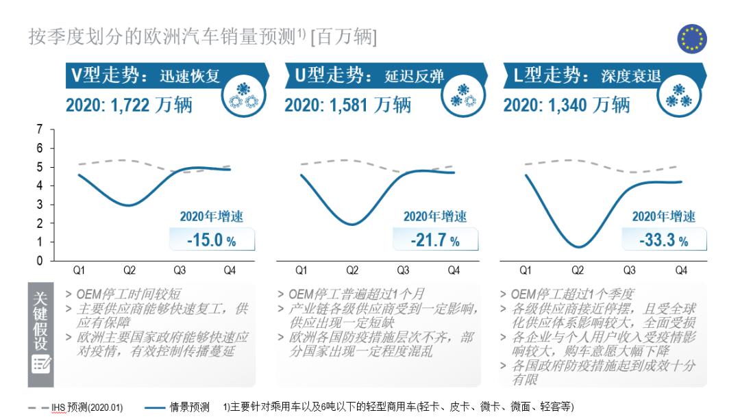 V型迅速恢复:汽车产业链各环节停工时间较短,复工有保障;欧洲各国政府均能够快速应对疫情,有效控制传播。欧洲汽车销量将在第2季度末开始反弹,全年下滑量维持在15%左右。