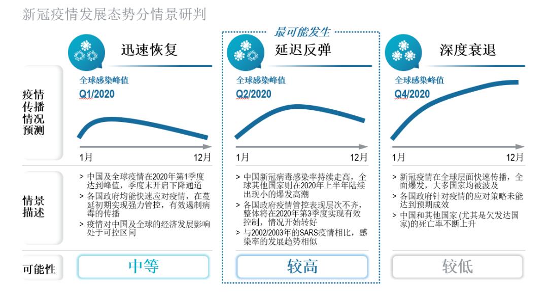 针对未来新冠疫情的发展态势,将存在“迅速恢复”、“延迟反弹”、“深度衰退”三种潜在情景,分别意味着全球感染峰值出现在今年第1季度、第2季度与第4季度。聚焦全球视角,“延迟反弹”情景发生的可能性相对较大,全球感染人数将在今年下半年逐渐回落。