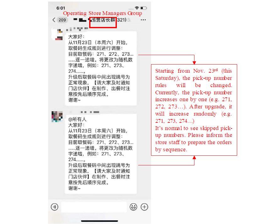 报告中还有很多瑞幸的造假证据,比如运营店长群里通知店长,注意取餐码的“跳号”的截图。