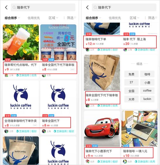 比如现在,在某鱼上依旧能搜到不少瑞幸代下业务,很多店铺都贴出: