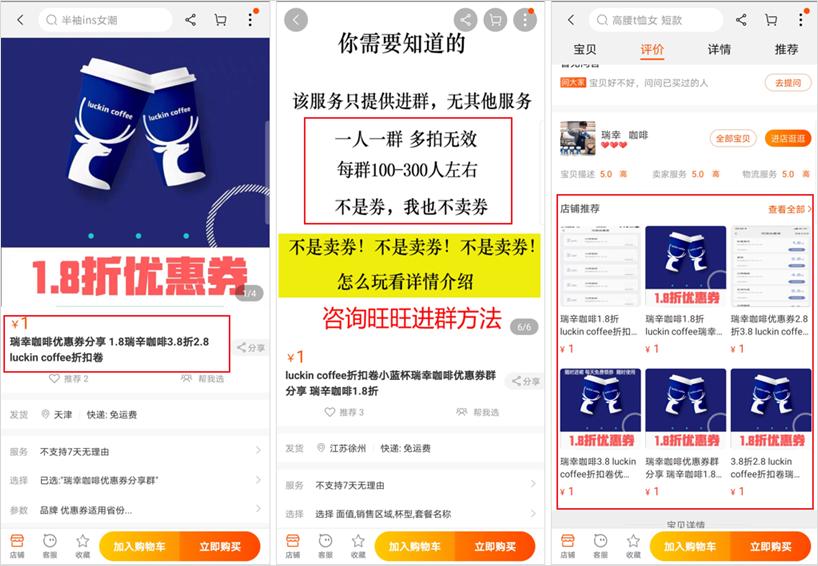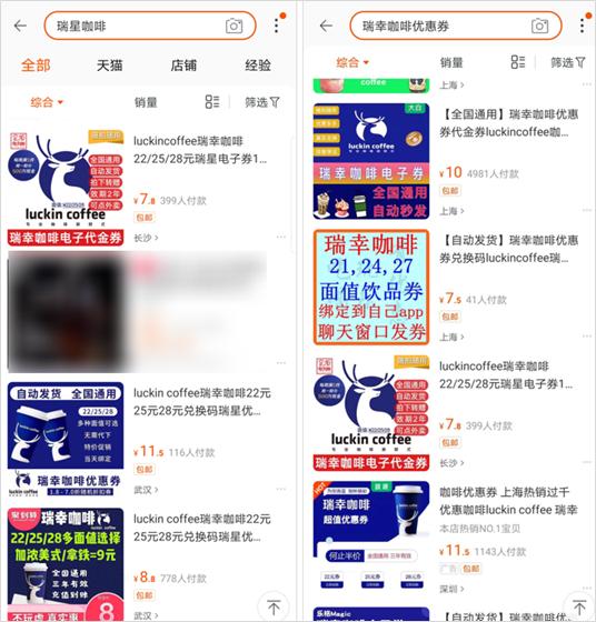比如在某宝上,就有很多卖瑞幸咖啡优惠券的店铺,面值 21、24、27……的各种优惠券,直接以 10 元左右的价格卖出。
